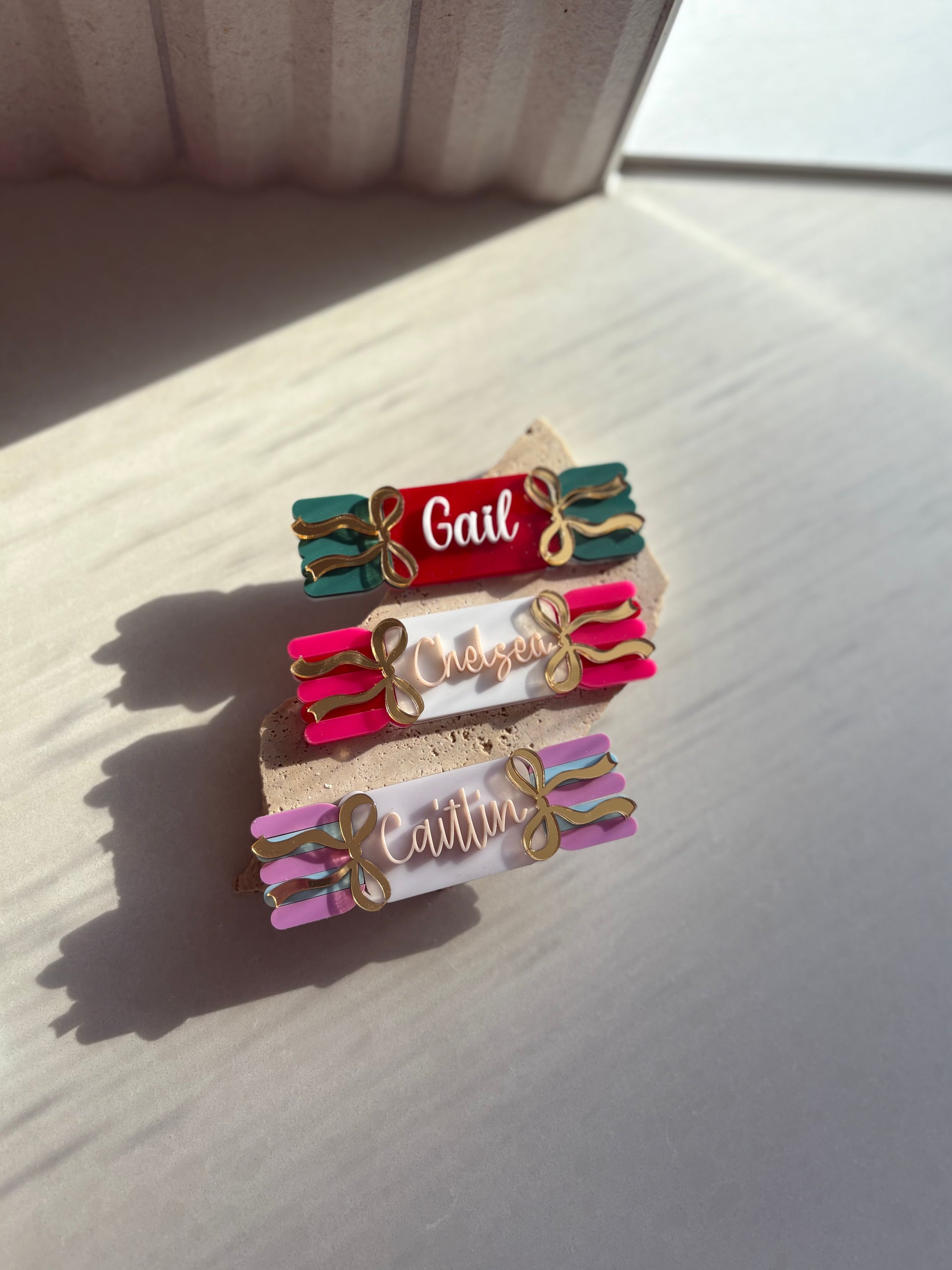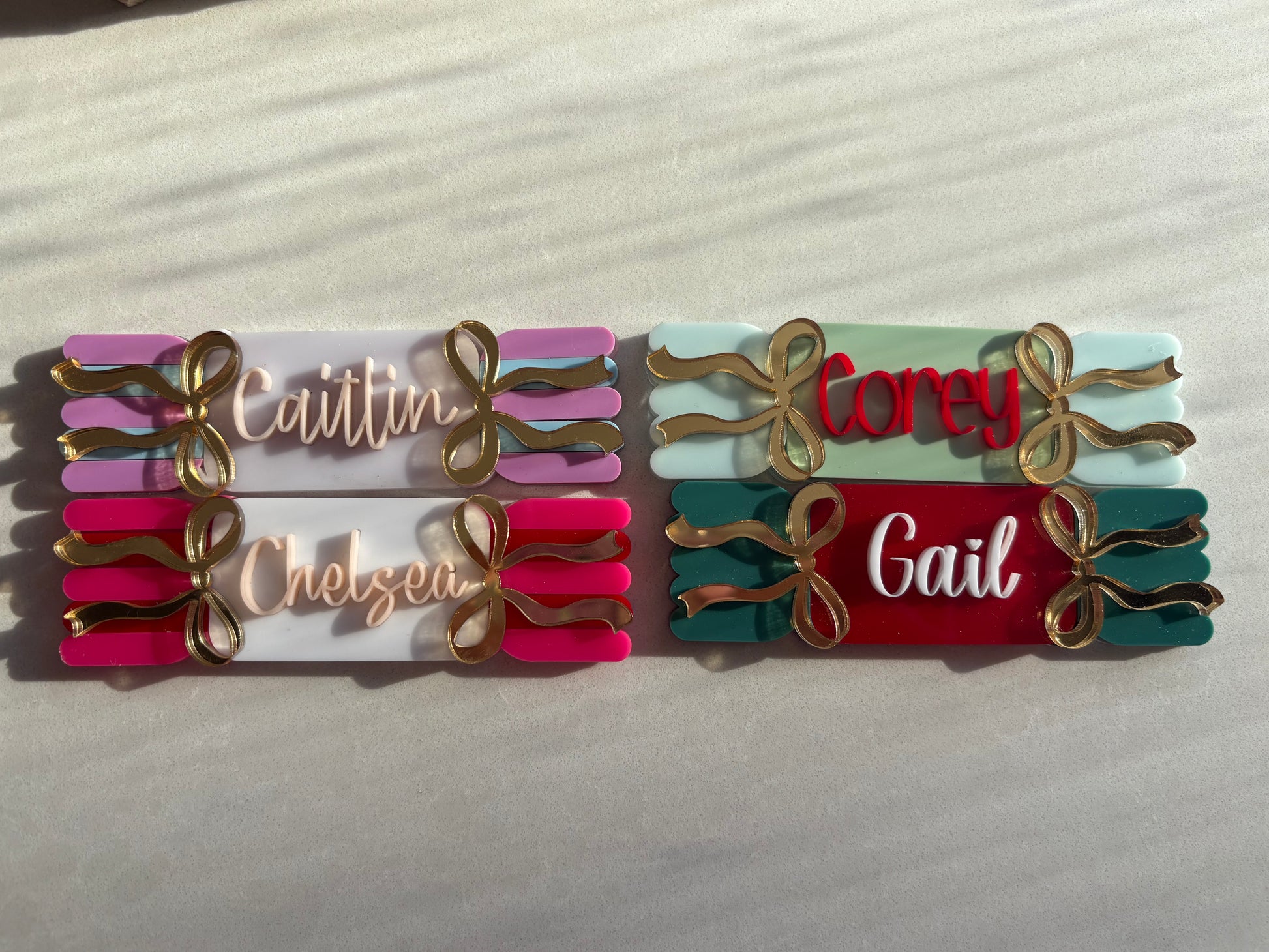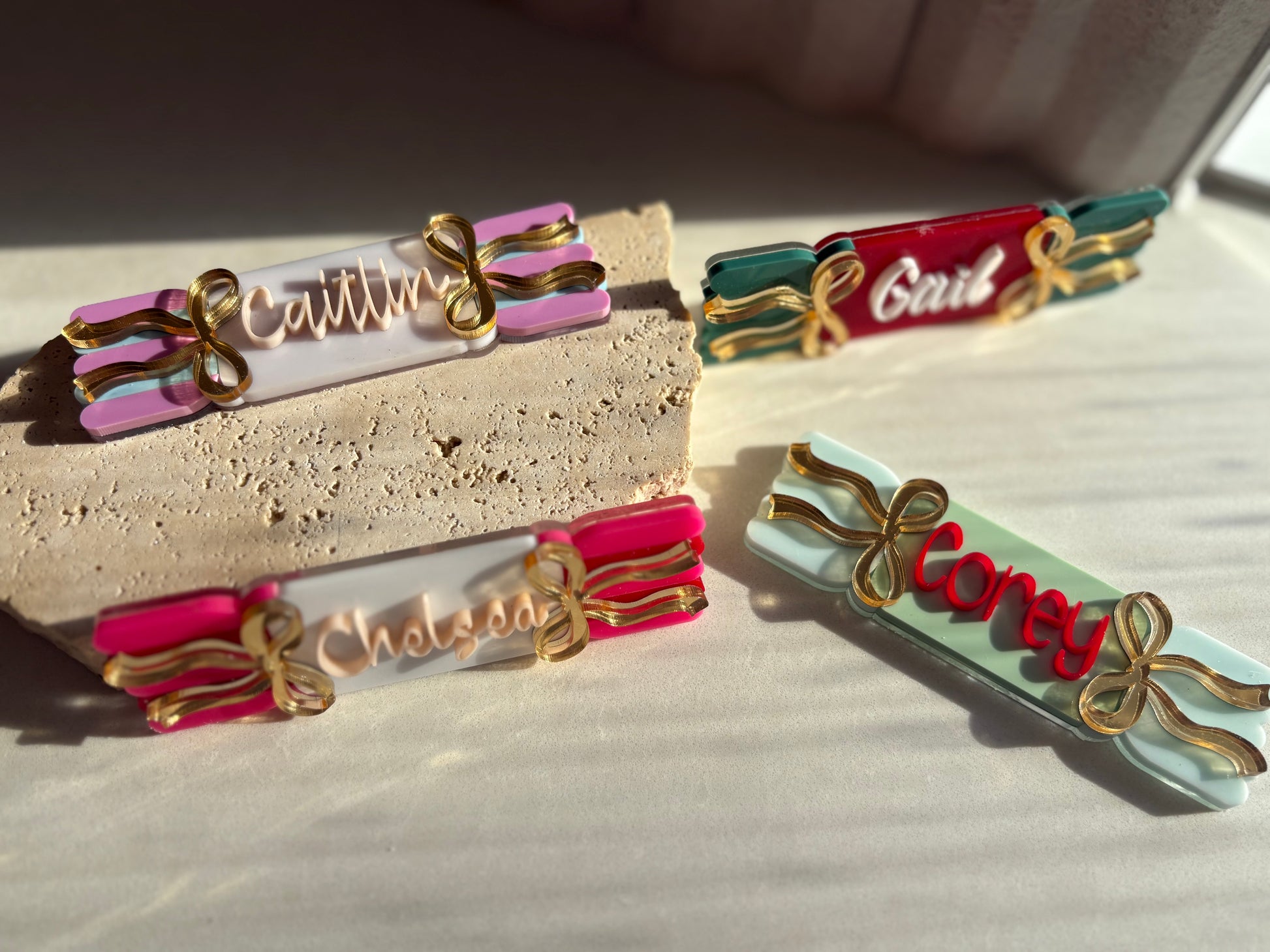 Each piece is made from premium acrylic and finished with a delicate mirror acrylic ribbon accent on each end. Personalised with each guest’s name in your chosen font and colour, these tags can also include an optional hanging hole — turning them into sweet ornament keepsakes your guests can treasure long after Christmas Day.