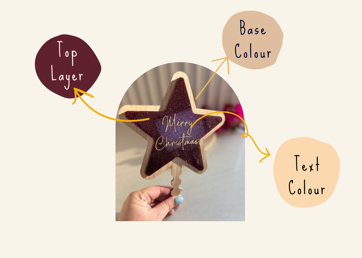 Crafted from layered acrylic and wood, these toppers bring a beautiful mix of sparkle and warmth to your tree. Each one can be personalised with your chosen colours, name or phrase, and text colour – making it a timeless keepsake to treasure year after year.