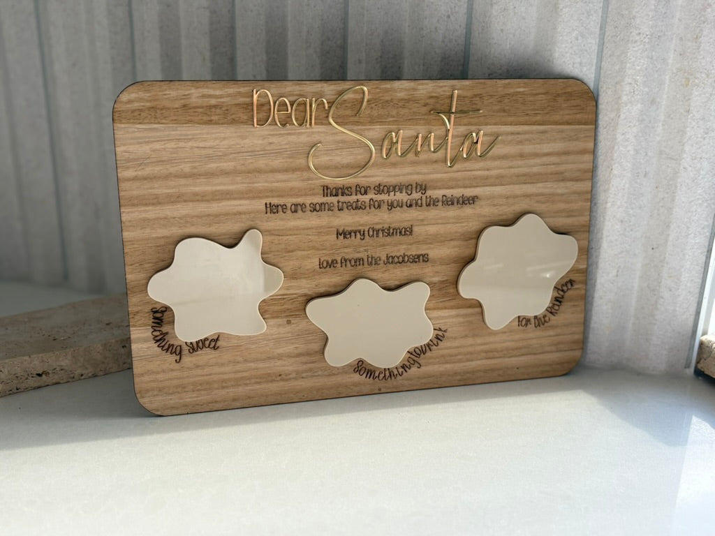 Each tray features a laser-engraved plywood base with layered acrylic details. With dedicated spots for a drink, a snack, and carrots for the reindeer. Choose from a range of designs — from simple circles to designs acrylic cut-outs — all made with care and attention to detail.