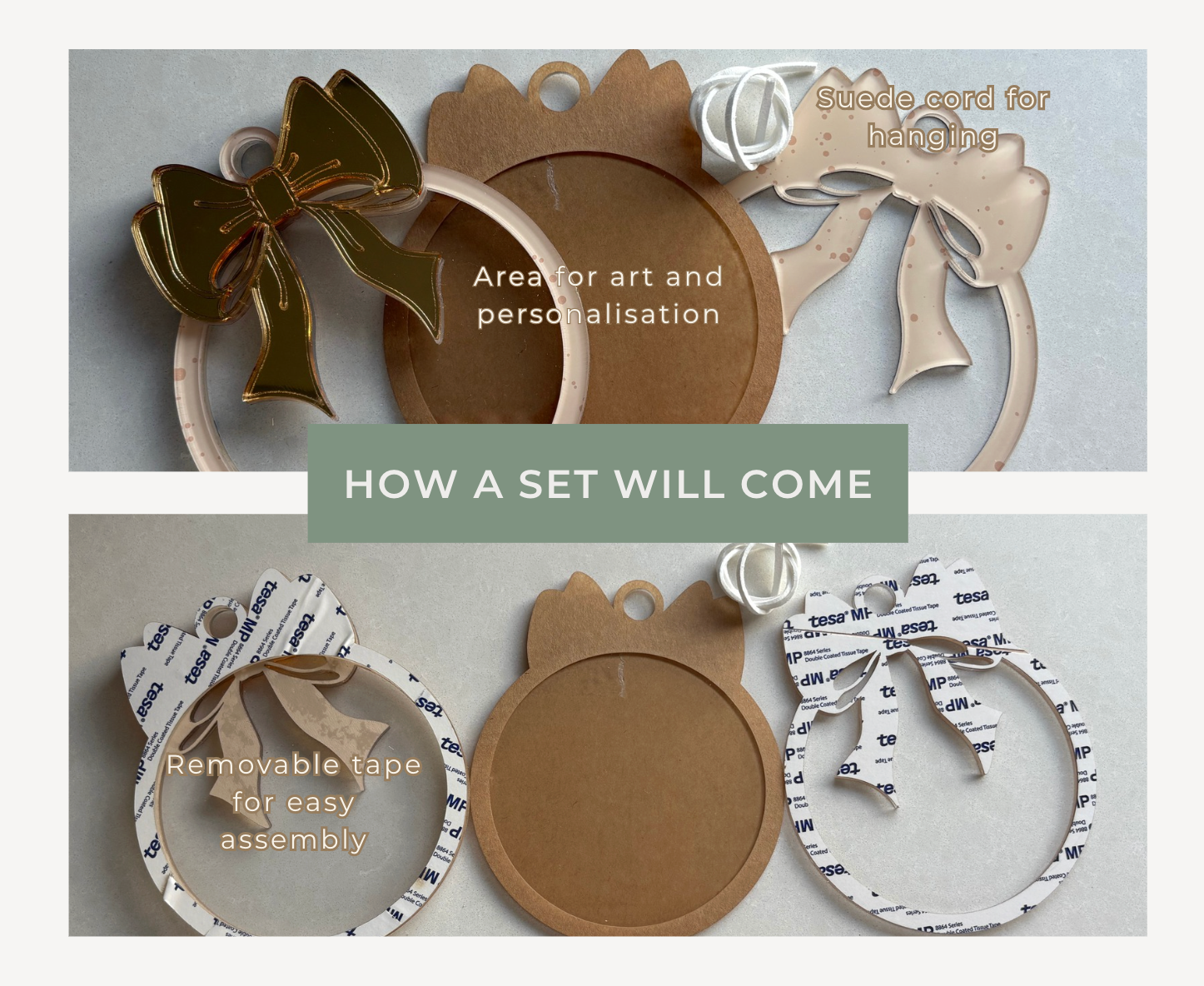 - The ornament will come partially assembled ready for your creative inclusion. The remaining parts will come with a stick adhesive on the back - just peel and stick to finalise the ornament