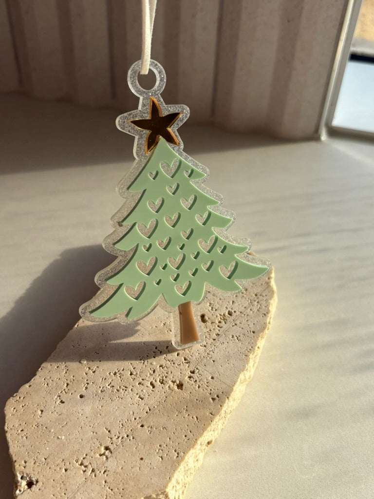 Finished with a gold star topper and your choice of tree colour, this ornament catches the light beautifully and adds a meaningful, modern touch to your tree.